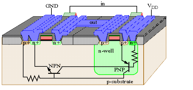 Parasitic bipolar transistors formed between n and p MOS transistors.