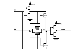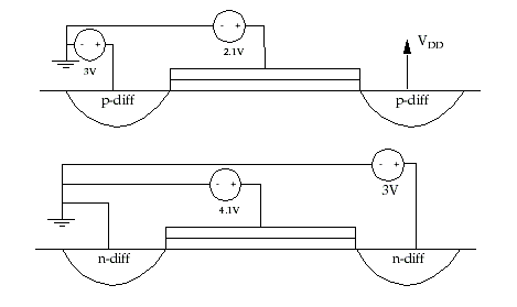 4)a) (6pts) Label each transistor with its region of operation (assume Vt is 1 volt for n-channel transistors and -1 volt for p-channel transistors).