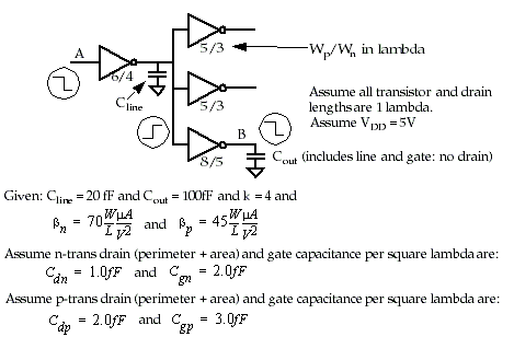 b) (17pts) Estimate the delay between nodes A and B for a falling transition on A using the simple gate delay model. CLEARLY INDICATE WHAT YOU ARE CALCULATING !!!!